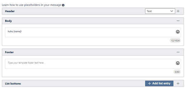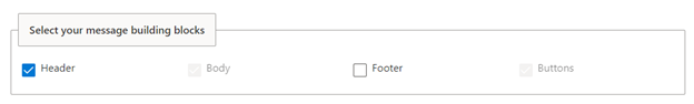 A control for configuring which message blocks to use (header/body/footer/buttons). Some options might be disabled, due to the type of the message (e.g. Reply Button messages have the “Buttons” section mandatory, you cannot uncheck it)