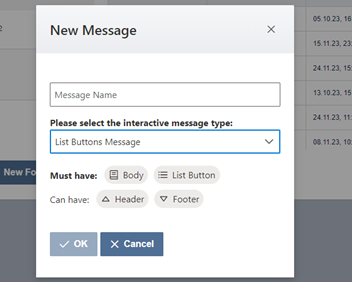 Under the WhatsApp -> Messages sections, the user can create Text messages, Media messages, Reply Button Messages and List Button Messages.