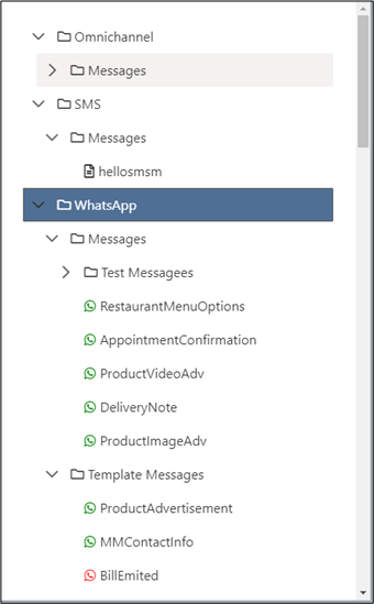 The tree structure of the Template Editor was reconfigured. At this point, there are three main directories („Omnichannel”, „SMS” and „WhatsApp”). Each of them can contain two folders („Messages” and „Template Messages”).