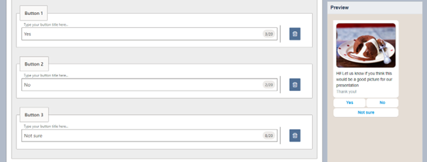 · Reply Buttons - maximum 3 Reply buttons. Each have a button title of max 20 characters