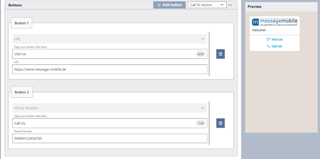 4. Buttons (mandatory) – this section consist of maximum 3 Reply buttons. Each have a button title of max 20 characters.
