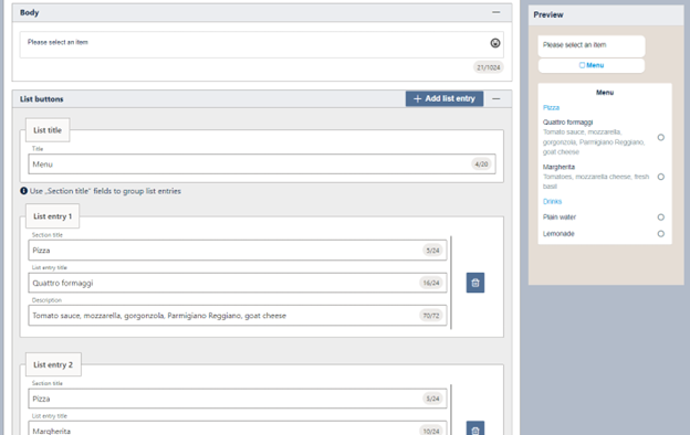 4. Buttons (mandatory) – this section consist of a “List title” field, and up to 10 list entries. These entries can be grouped under different sections.